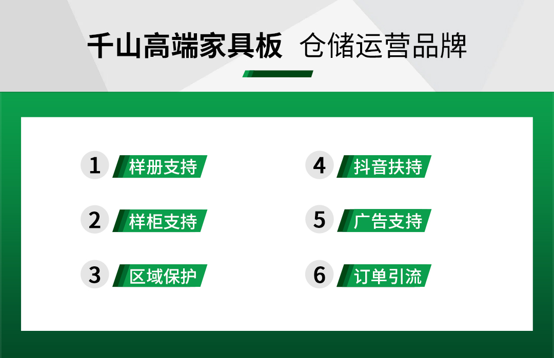 作為高端家具板倉儲(chǔ)運(yùn)營品牌,千山依托家具板倉儲(chǔ)一體化運(yùn)營模式,將持續(xù)為全國加盟商及消費(fèi)者提供更優(yōu)質(zhì)的家具板產(chǎn)品與服務(wù),期待更多的家具廠伙伴加入千山家具板倉儲(chǔ)運(yùn)營事業(yè),乘風(fēng)并進(jìn),共謀發(fā)展!