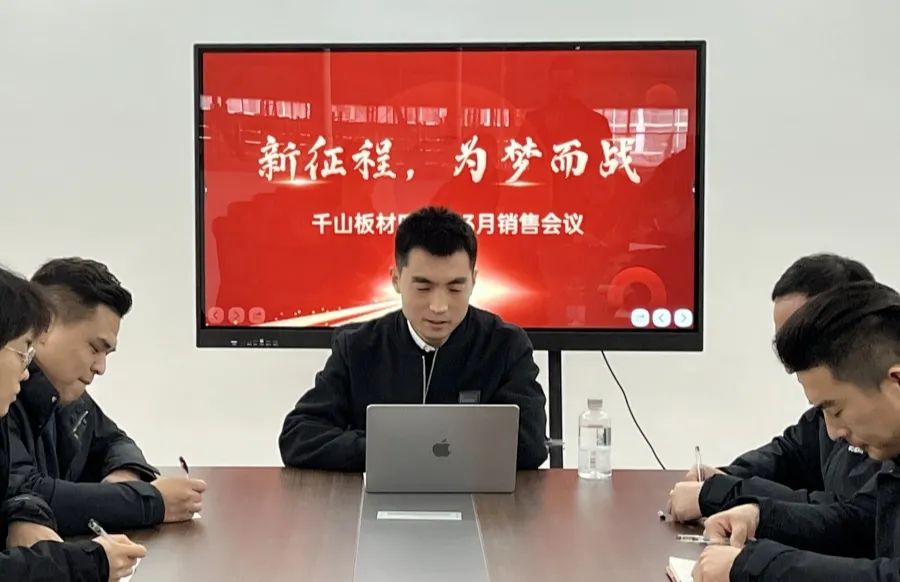 2024 年3月7日,千山板材四川倉3月份銷售會議在成都順利召開。會議由千山品牌事業(yè)部總經(jīng)理王松主持,四川倉總經(jīng)理曹全震及全體銷售人員參會。此次會議既是四川倉銷售工作部署會,也是四川倉啟動動員會,明確了奮斗目標,鼓舞了士氣。