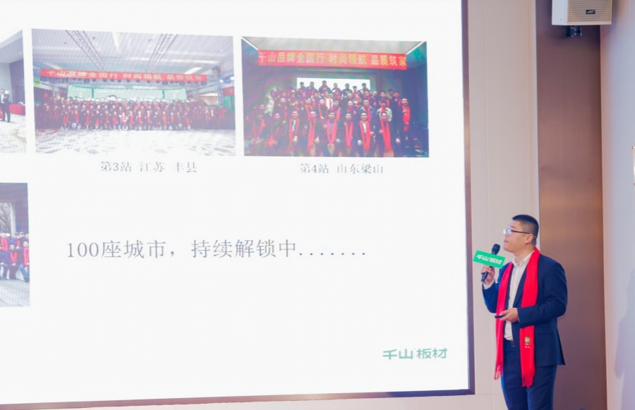 千山板材區域經理孟曉圍繞生產實力、企業文化、業務模式等,生動描繪了千山26年的發展歷程,傳遞了千山“以推進健康、時尚,潮流家居、裝飾材料為已任,引領行業新潮流” 的品牌使命。