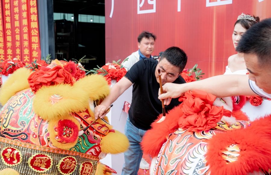 頓興明總經(jīng)理和于常成總經(jīng)理共同為開業(yè)醒獅點(diǎn)睛。禮花漫天,喜氣洋洋,醒獅歡騰,大吉大利!栩栩如生的雄獅,象征著廣西生產(chǎn)基地紅紅火火,前程似錦!