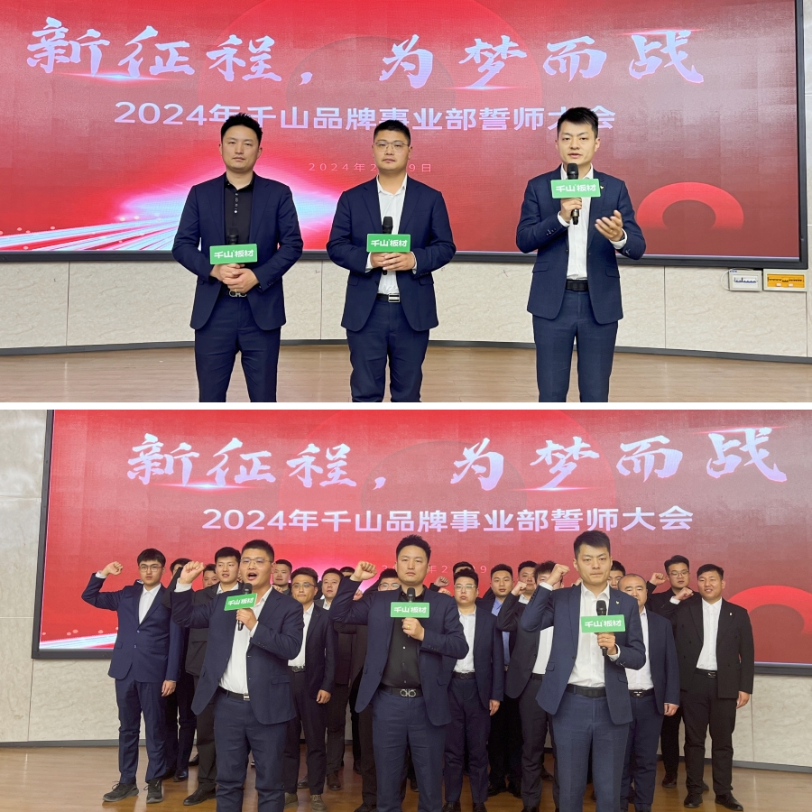 2024年2月,“新征程 為夢而戰”2024千山品牌事業部誓師大會高燃啟動。全體營銷精英集結一堂,簽署目標軍令狀,燃情宣誓,吹響全面決勝的集結號,奮力沖刺全年銷售目標。