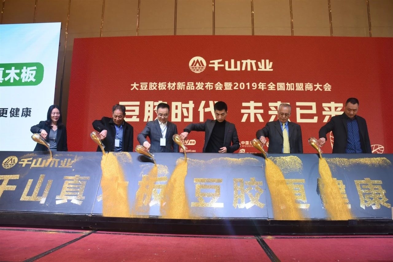 2019年3月21日,在板材之都山東臨沂舉行了“豆膠時代·未來已來”新品發布會暨2019年全國加盟商大會。千山大豆膠板材成功上市,意味著板材行業由脲醛膠E0級時代跨入植物豆膠新時代!