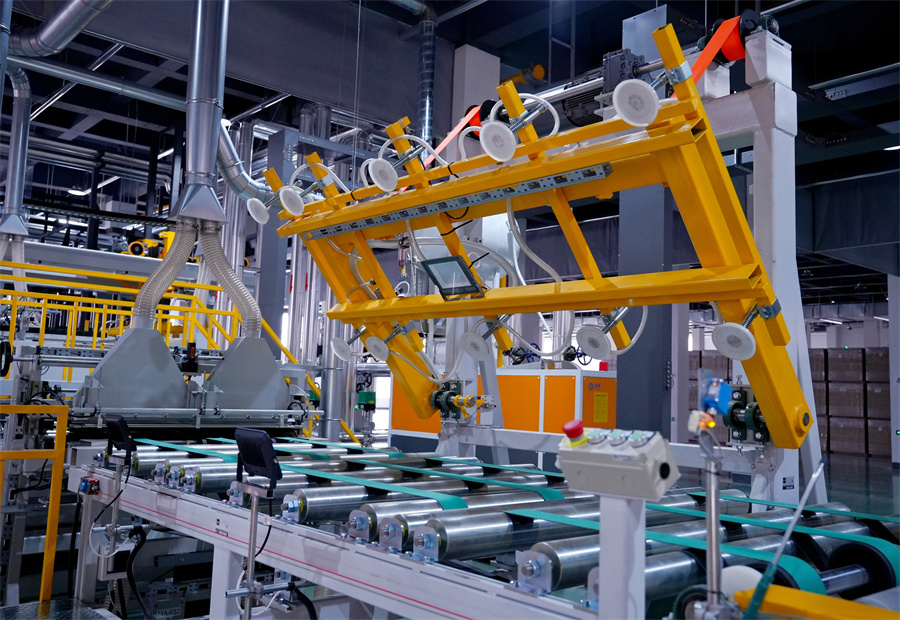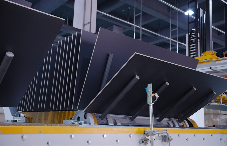 作為“壓貼領(lǐng)域的領(lǐng)導(dǎo)者”,溫康納在短周期壓貼領(lǐng)域處于世界領(lǐng)先地位,占據(jù)了國(guó)內(nèi)高端市場(chǎng)。相比于傳統(tǒng)壓貼產(chǎn)線(xiàn)數(shù)分鐘的周期,溫康納產(chǎn)線(xiàn)的壓貼周期大幅壓縮,效率提升數(shù)倍以上,產(chǎn)能可達(dá)到4800張/20小時(shí)。 溫康納智能化產(chǎn)線(xiàn)實(shí)現(xiàn)全流程自動(dòng)化無(wú)縫銜接,從自動(dòng)上下料、自動(dòng)進(jìn)板裝置到壓機(jī)壓貼、清邊倒角、翻板檢驗(yàn)等,每個(gè)環(huán)節(jié)都實(shí)時(shí)調(diào)控。更令人驚嘆的是紅外激光精準(zhǔn)對(duì)紋系統(tǒng),將誤差嚴(yán)格控制在毫米級(jí)以?xún)?nèi),使板材紋理對(duì)接的美觀度實(shí)現(xiàn)質(zhì)的飛躍。 溫康納生產(chǎn)線(xiàn)保證了板材在最大壓貼范圍內(nèi)材料之間的最小厚度差,能夠更靈活地使用基材,同時(shí)確保產(chǎn)品質(zhì)量的穩(wěn)定性。溫康納的精密與進(jìn)口鋼板“珠聯(lián)璧合”,將使千山板材潮流花色達(dá)到行業(yè)新高度,實(shí)現(xiàn)高顏、高質(zhì)、高品體驗(yàn)。 溫康納生產(chǎn)線(xiàn)的引進(jìn)是千山智能制造戰(zhàn)略的重要組成部分。在消費(fèi)升級(jí)和產(chǎn)業(yè)轉(zhuǎn)型的大背景下,千山并沒(méi)有選擇簡(jiǎn)單擴(kuò)大產(chǎn)能的道路,而是通過(guò)引進(jìn)頂尖技術(shù)裝備,實(shí)現(xiàn)從“制造”到“智造”的跨越。