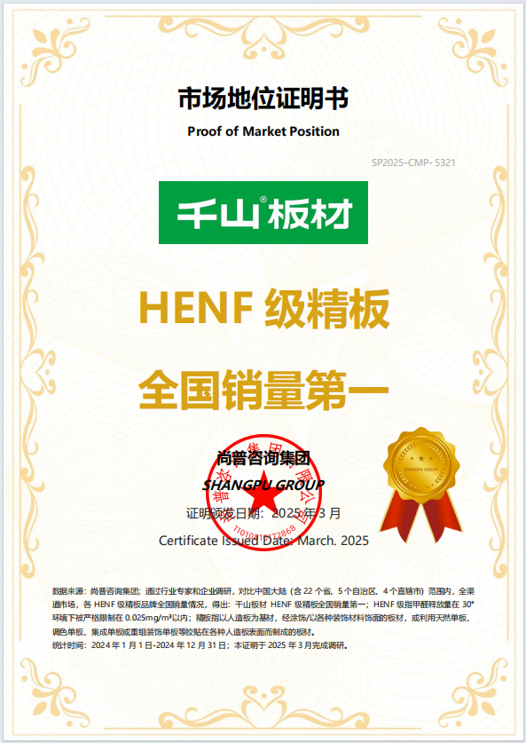 28年老牌板材大廠的深厚積淀,是千山高質價比的堅實后盾。作為中國板材國家品牌、HENF級精板全國銷量第一品牌,千山擁有全方位的品質認證體系——HENF級環保認證、兒童安全認證、近0氣味認證,自主研發的凈醛、抗菌、抗病毒技術均獲得權威檢測報告支持。依托成熟的國產智能化供應鏈,我們實現產能穩定、品控嚴格、成本可控的三重保障,讓高端品質板材以親民價格落地,真正做到“好板不貴、品質可鑒”。