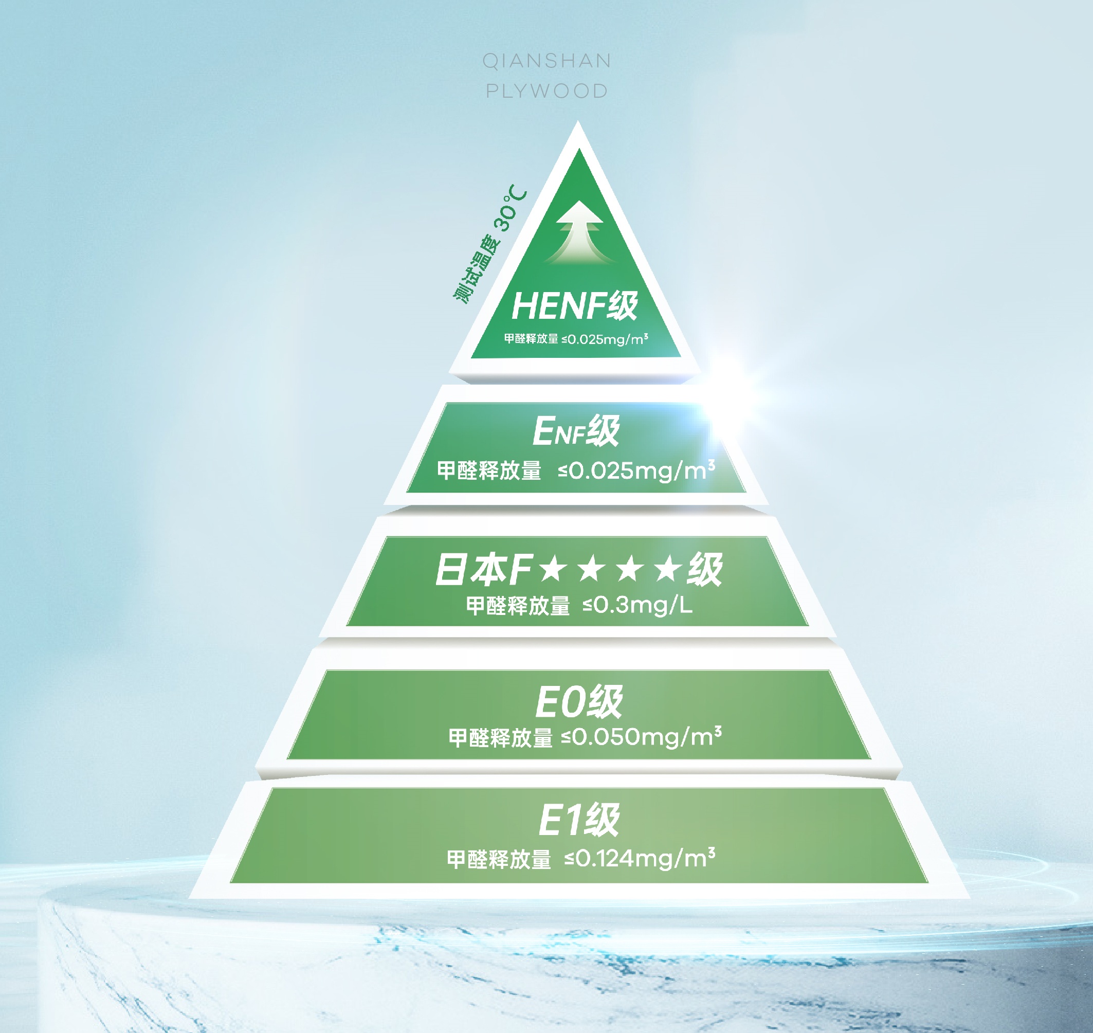 傳統板材環保標準多聚焦于常溫環境下的甲醛釋放量,而HEnf級的甲醛釋放量在30℃熱環境下被嚴格限制在0.025mg/m3以內,是中國林產工業協會于2022年5月31日發布的《采暖用人造板及其制品中甲醛釋放限量》(T/CNFPIA 1003-2022)標準中的最高等級。HENF級:環保的升級躍遷千山板材四大品類: