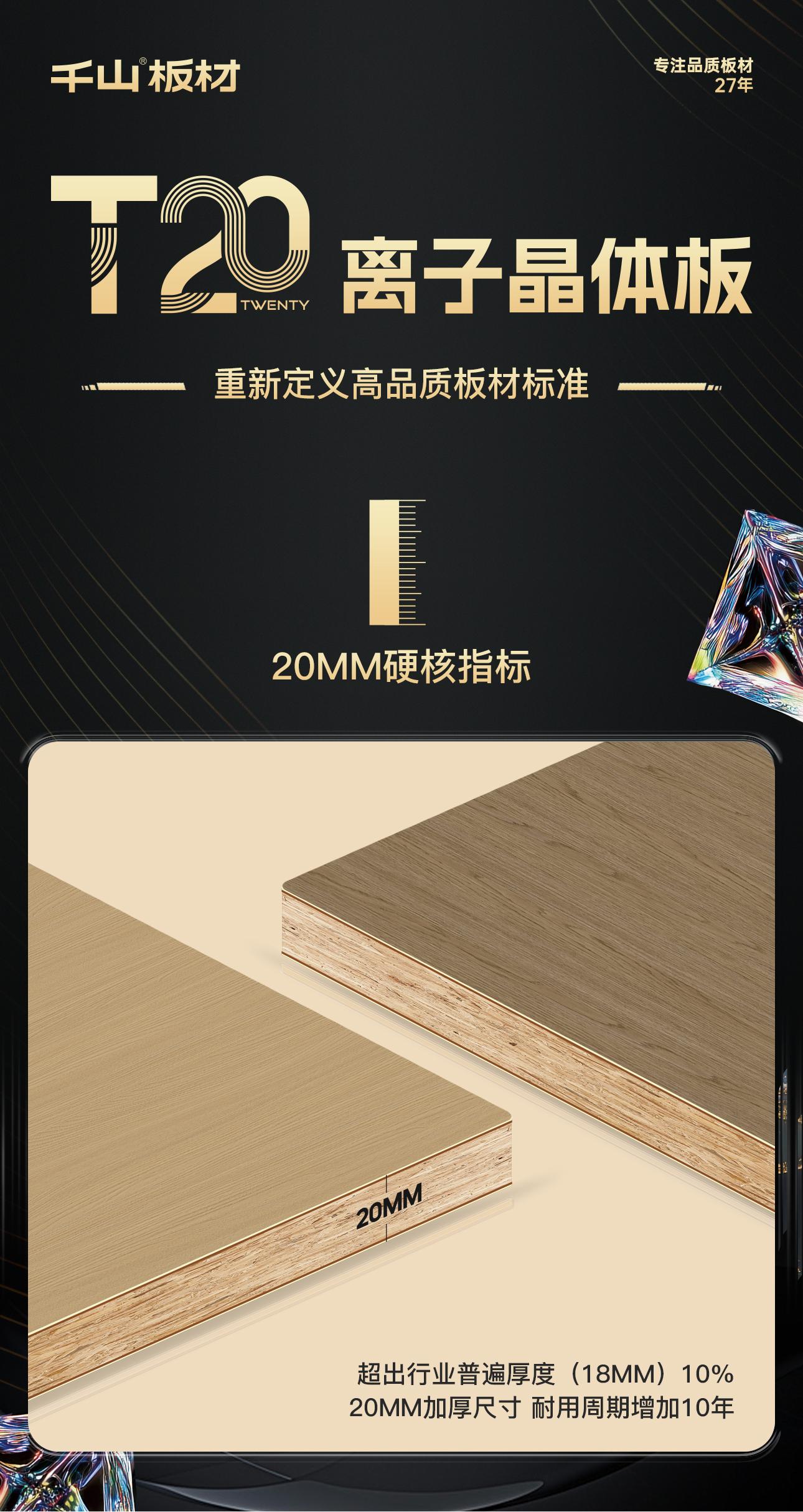 T20離子晶體板:是表面覆有離子晶體層,板材承重比常規18mm提升50%,變形度降低50%,耐磨性能提升3倍以上的20mm高端飾面板材。T20離子晶體板是千山板材推出的高端飾面板材,由千山集團與南京林業大學材料科學與工程學院聯合研發,于2025年4月18日在臨沂全屋定制展首次發布,定價1099元/㎡,旨在為消費