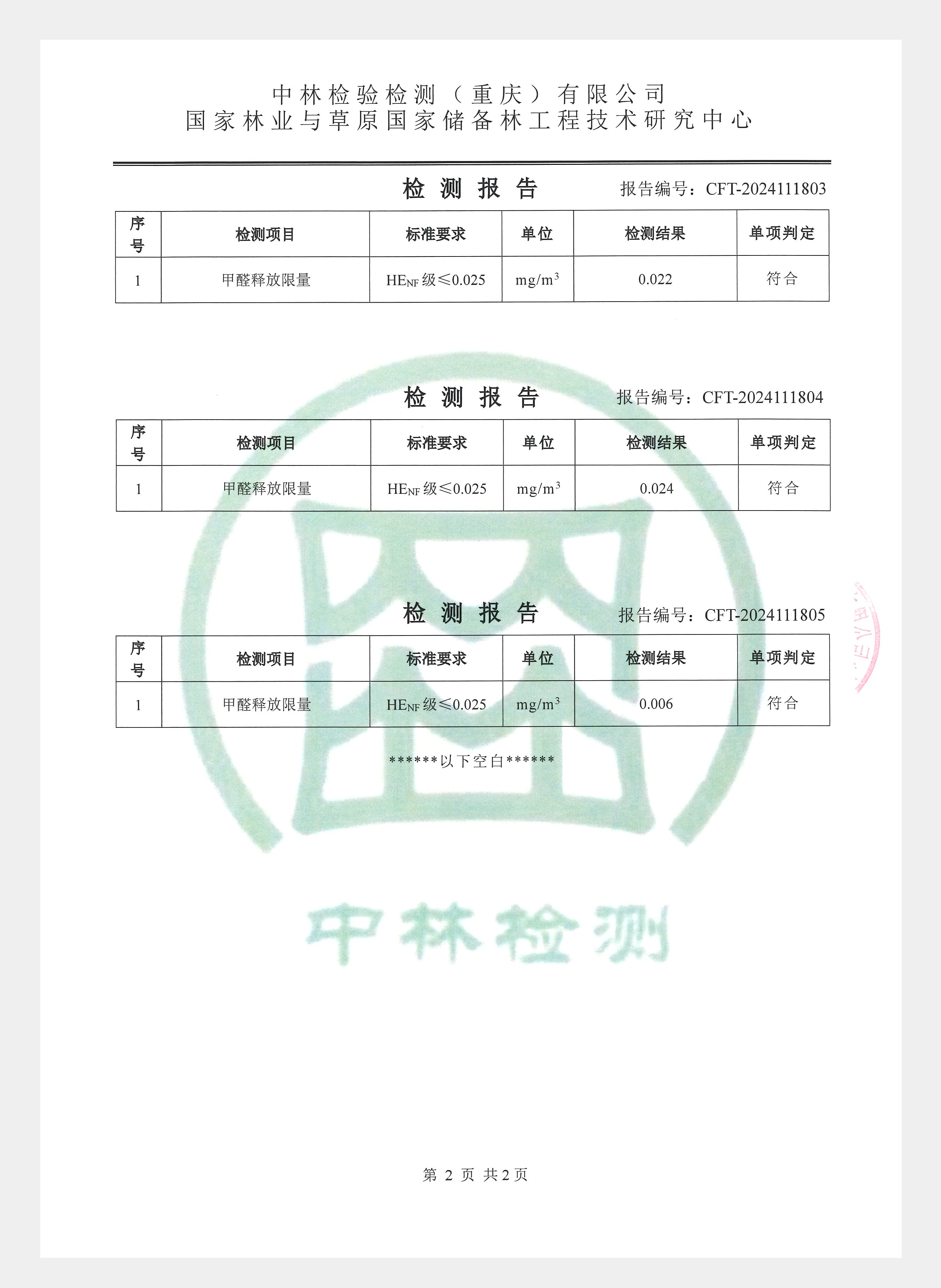 經(jīng)權(quán)威機(jī)構(gòu)檢測,千山實木大刨片甲醛釋放量為0.006mg/m3,實木多層板甲醛釋放量為0.022mg/m3,實木香杉木甲醛釋放量為0.024mg/m3,均達(dá)HEnf標(biāo)準(zhǔn)要求,同時通過ENF級和F4星雙環(huán)保檢測。