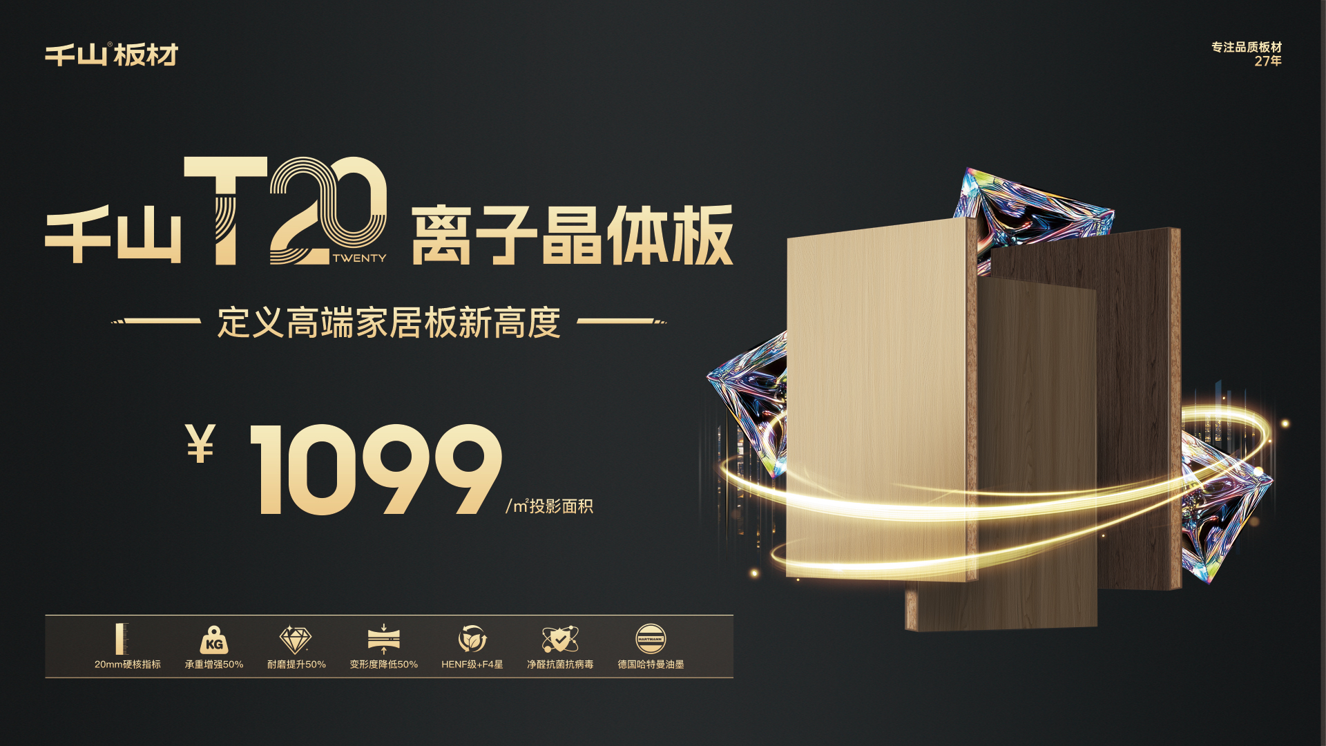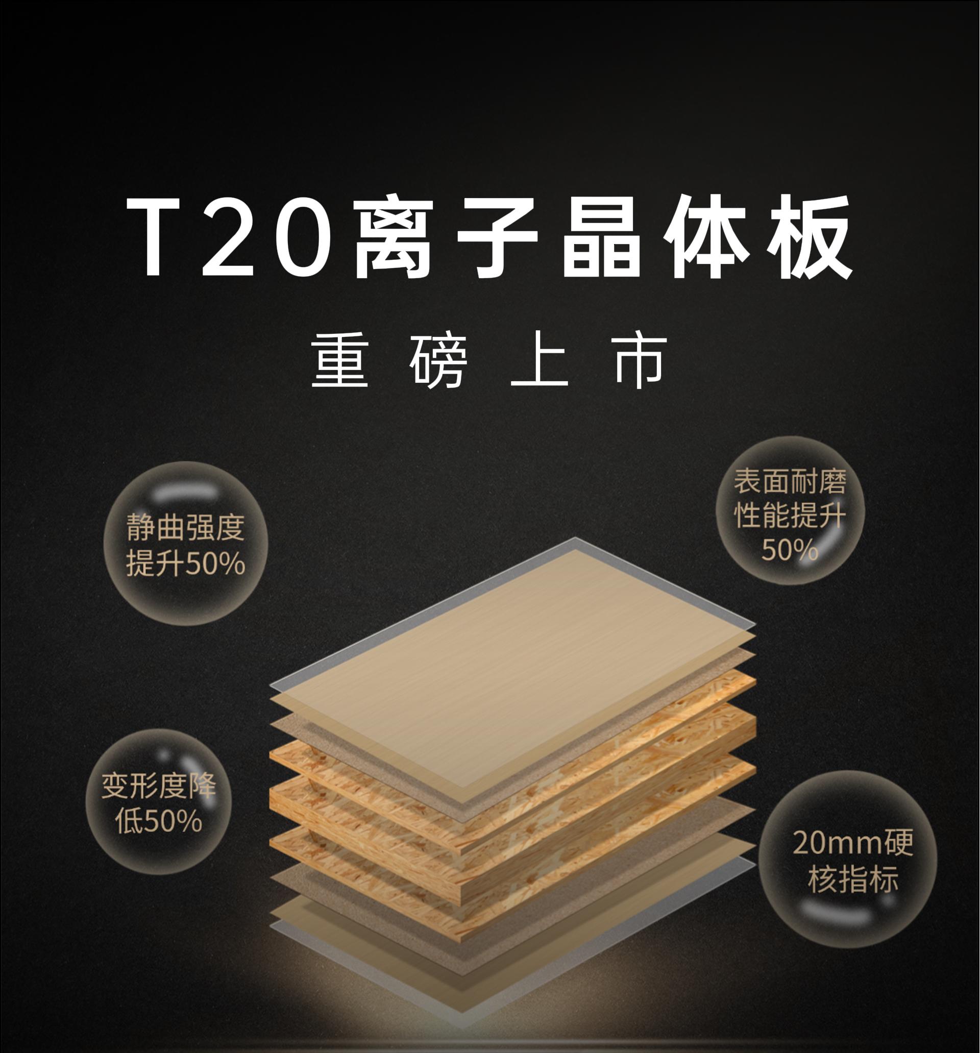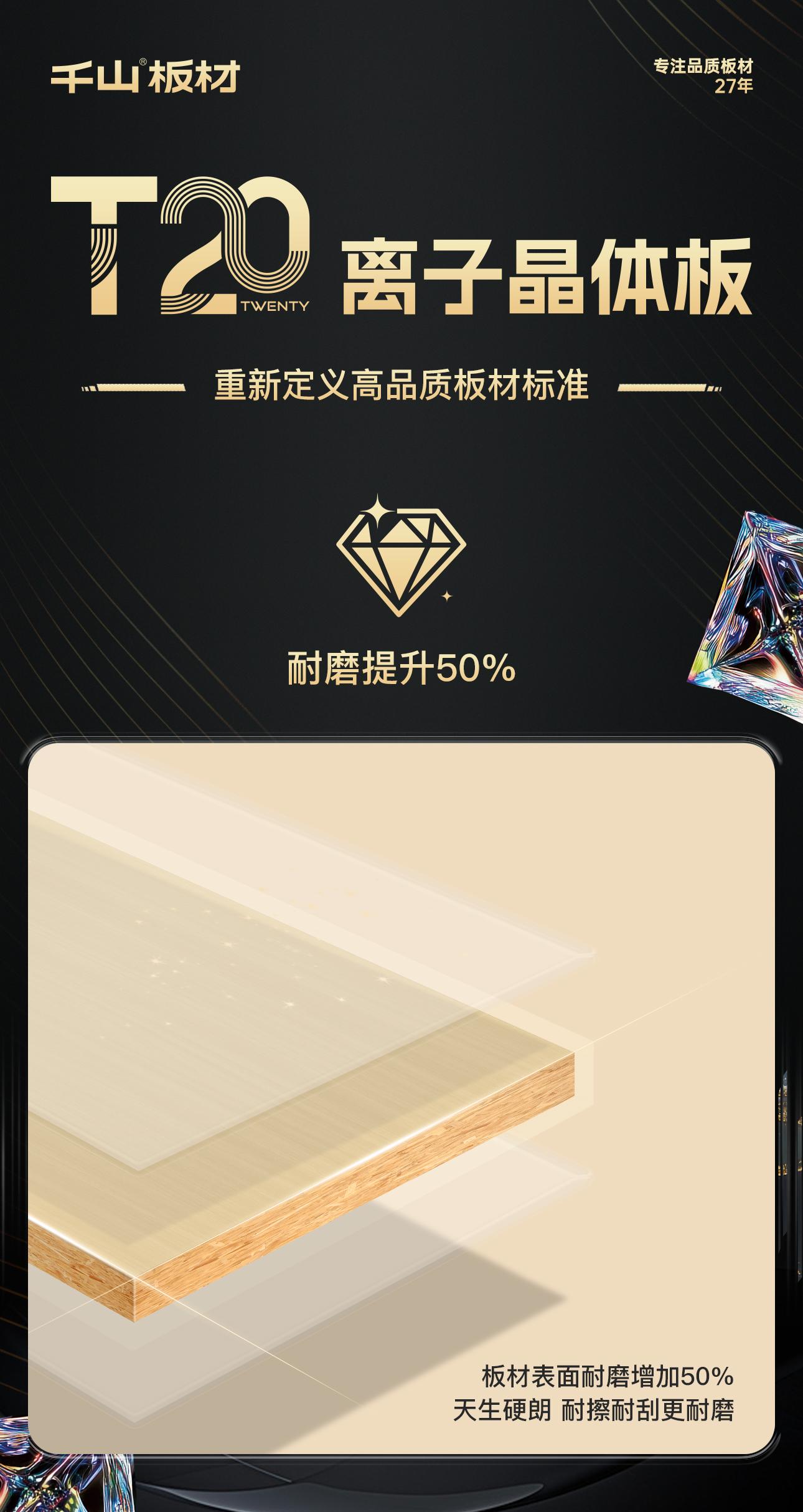 千山板材重磅推出T20離子晶體板,以20mm厚度、高強承重、高能抗變形、超強耐磨的優異性能,顛覆傳統門板的性能界限,重新定義高品質板材標準,實現產品穩定性與空間美觀性的極致效果,成就柜體柜門通配、一門到頂的超能應用。