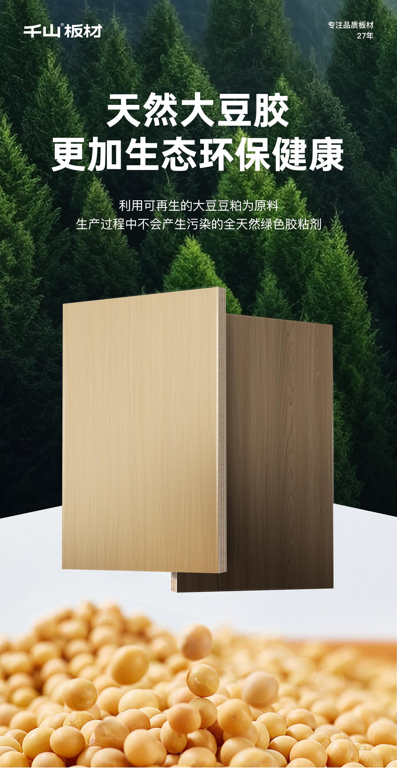 千山大豆膠板材利用大豆分子改性技術(shù),解決傳統(tǒng)大豆膠的耐水性、膠合性缺陷,具有更好地粘合性能,提升了板材的膠合強(qiáng)度、耐水性及靜曲強(qiáng)度,保證板材的抗變形、防潮防霉、不易老化性能,延長使用壽命。