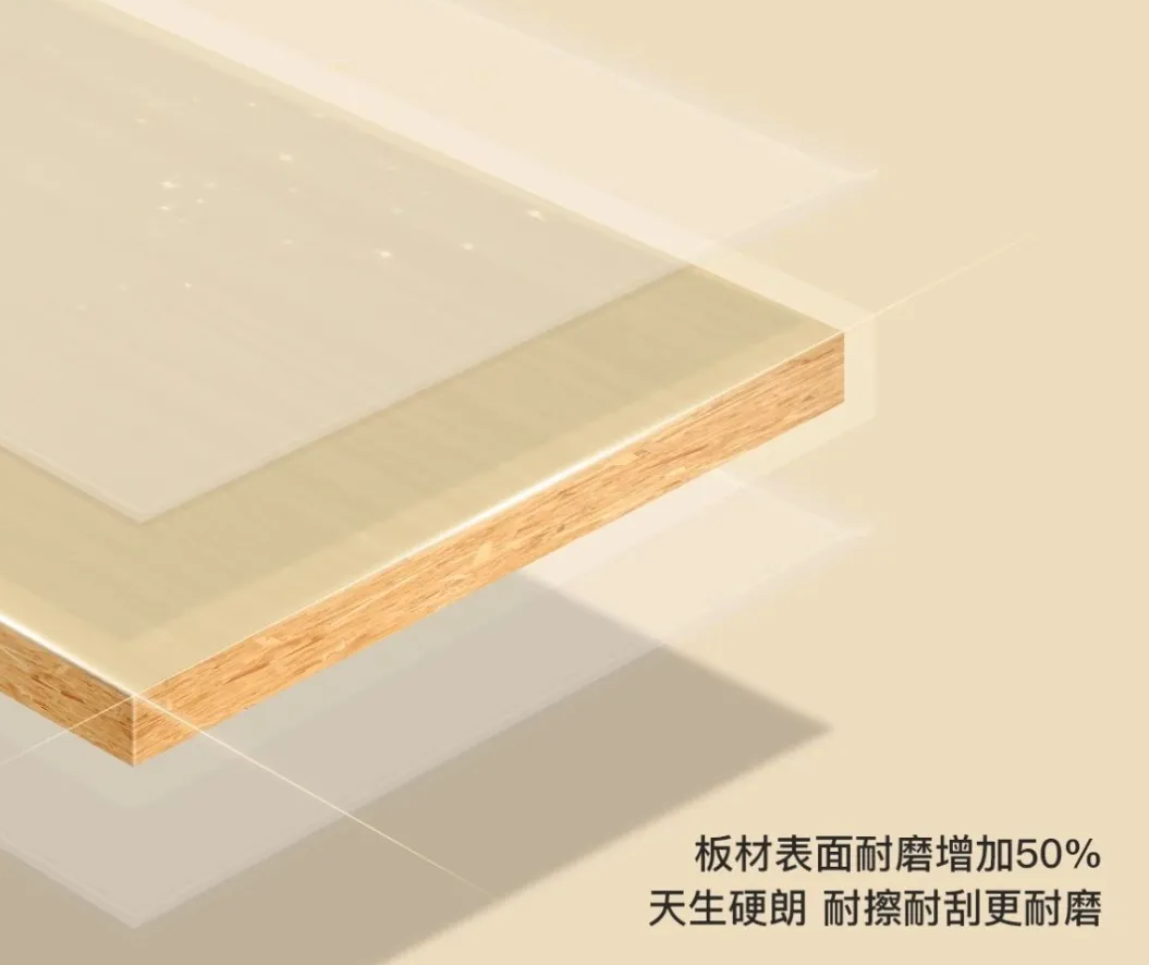 高密度離子晶體層有效分散外部壓力,吸收沖擊能量,從而顯著增強(qiáng)板材的垂直承載極限。20mm厚度,超出行業(yè)板材普遍厚度(18mm)10%,有效提升了板材的承重力,承重性能提升50%,輕松應(yīng)對(duì)大空間儲(chǔ)物承壓需求。