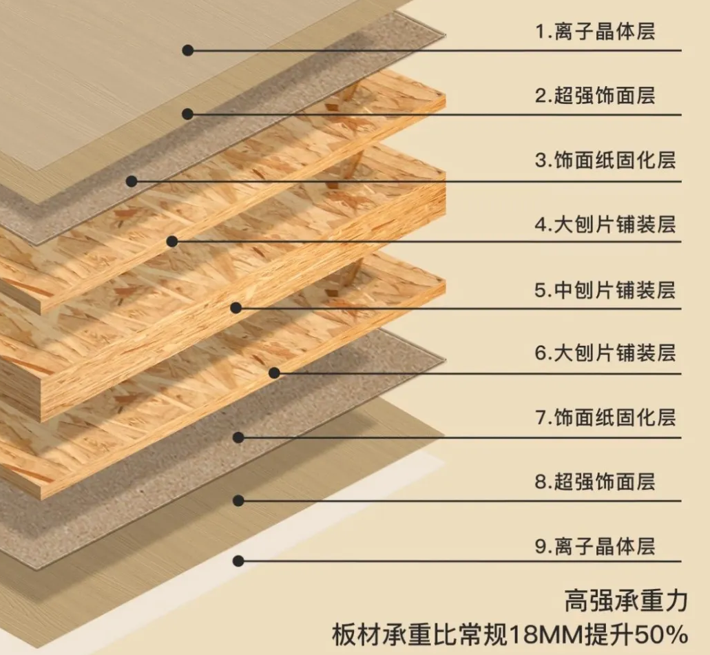 采用德國(guó)迪芬巴赫連續(xù)平壓線生產(chǎn),內(nèi)芯刨片均勻縱橫交錯(cuò)壓合。5層定向鋪裝結(jié)構(gòu),使其內(nèi)結(jié)合強(qiáng)度更高,從而賦予了離子晶體板穩(wěn)定堅(jiān)韌的特性,能夠經(jīng)受住南北方特殊氣候考驗(yàn),耐用周期延長(zhǎng)10年。